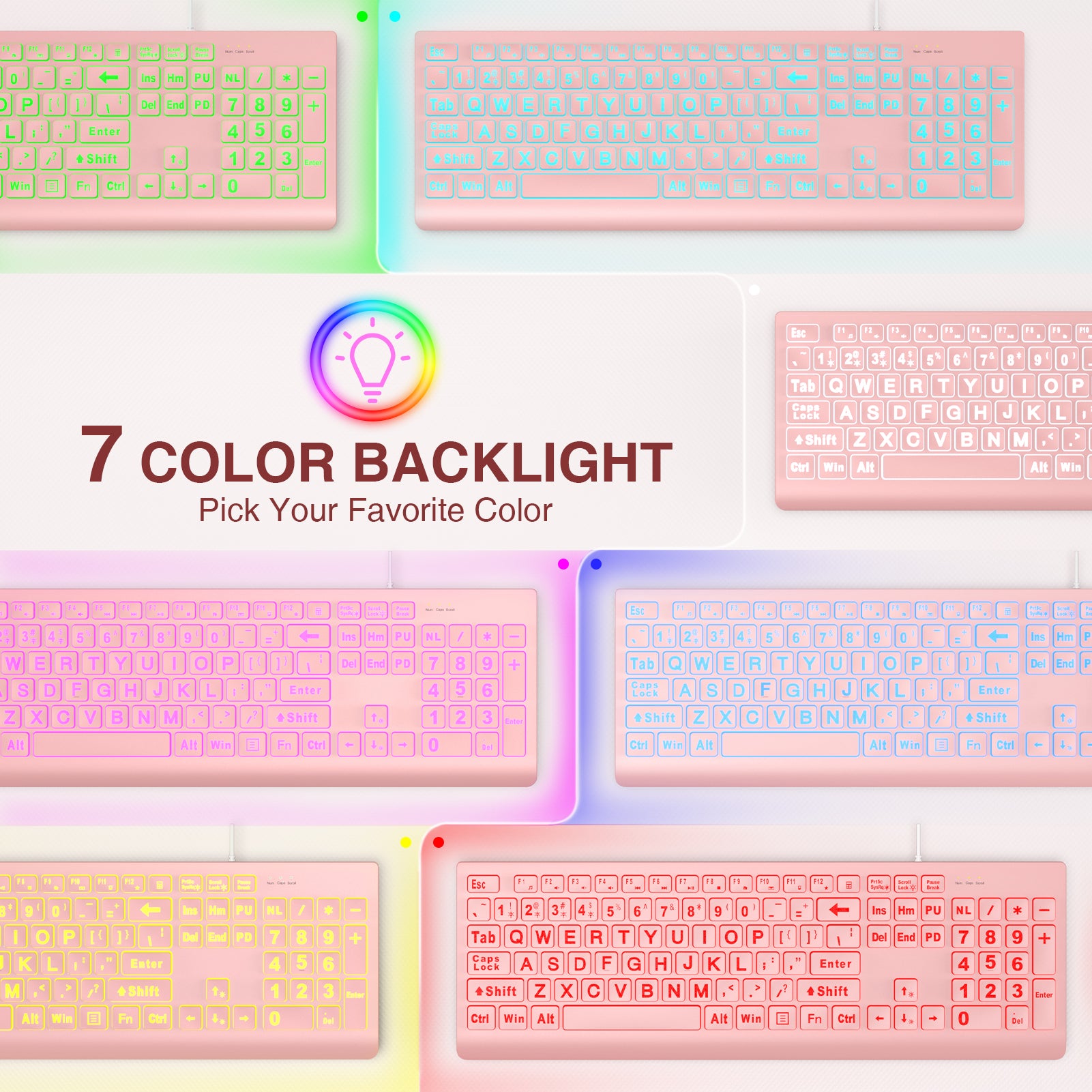 Wagpak Large Print Backlit Keyboard - Wired USB Lighted Computer Keyboard for Laptops,Pink