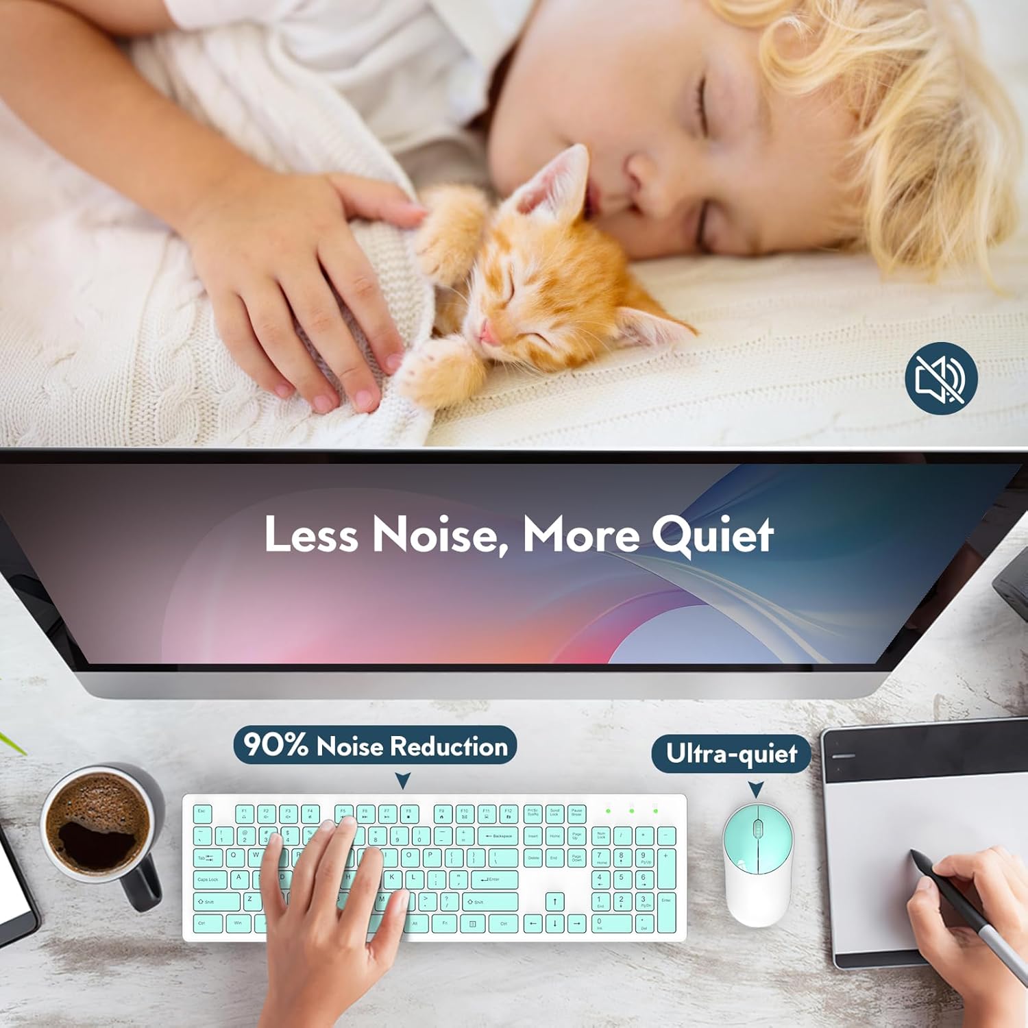 - ---Low Noise: The wireless silent keyboard and mouse are designed with comfort and silence in mind. Low-profile keys and silent click buttons bring a more pleasant experience
