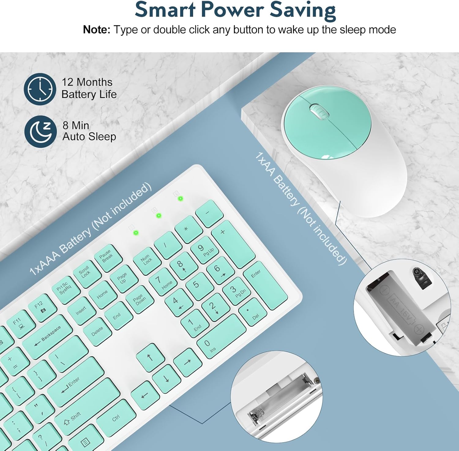 - ----Intelligent Energy Saving Mode: The wireless mouse and keyboard combo have the function of automatically entering power saving state. When they are in sleep mode, you can wake them up with just a press of a button when you need them.